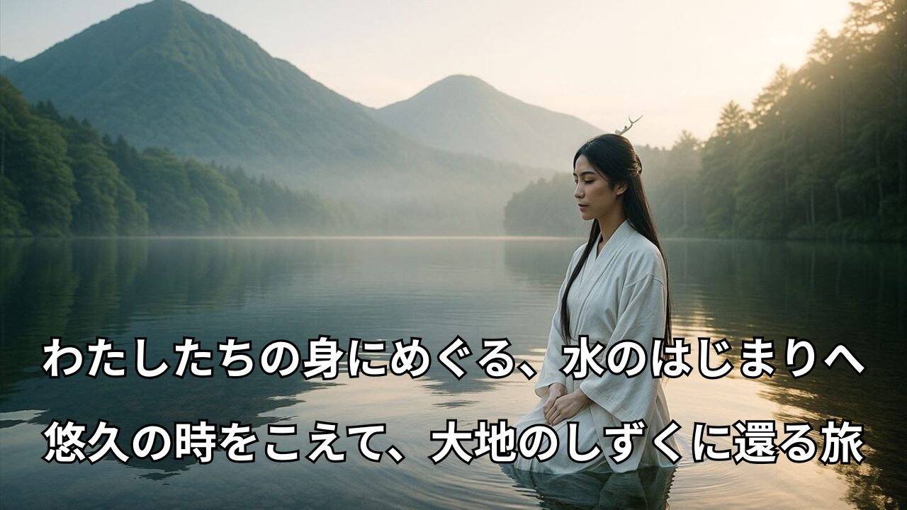 わたしたちの体をめぐる水。それは、はるか昔、天の光とともに大地に降り注いだ「しずく」の記憶。太陽の女神アマテラスの光に導かれ、生命は水とともに生まれ、めぐり、つながってきました。悠久の時をこえ、いま再び――水の源へと還る旅が、はじまります。